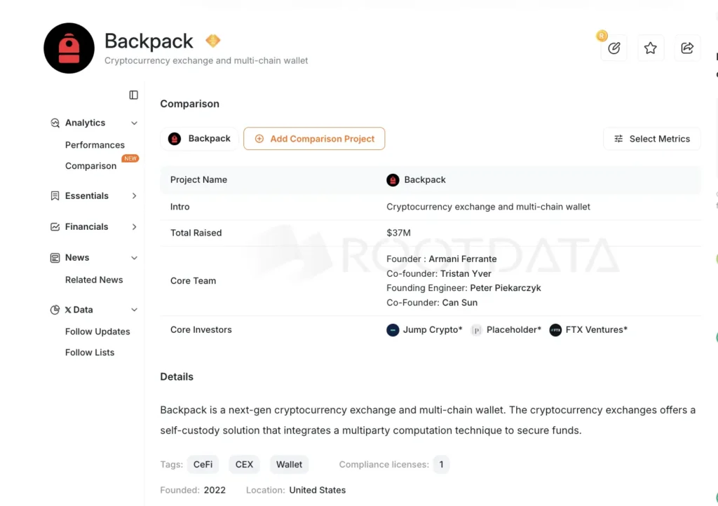 Backpack 由 FTX 前團隊成員 Armani 和 Tristan 創立的中心化的加密貨幣交易所,已獲得 3700 萬美元的融資,投資者包括 Jump Crypto、FTX Ventures 和 Multicoin Capital 等頂級機構。Backpack 在 2022 推出自託管 Backpack Wallet 錢包服務,支援 Solana、ETH 和 BTC 網路資產交易。