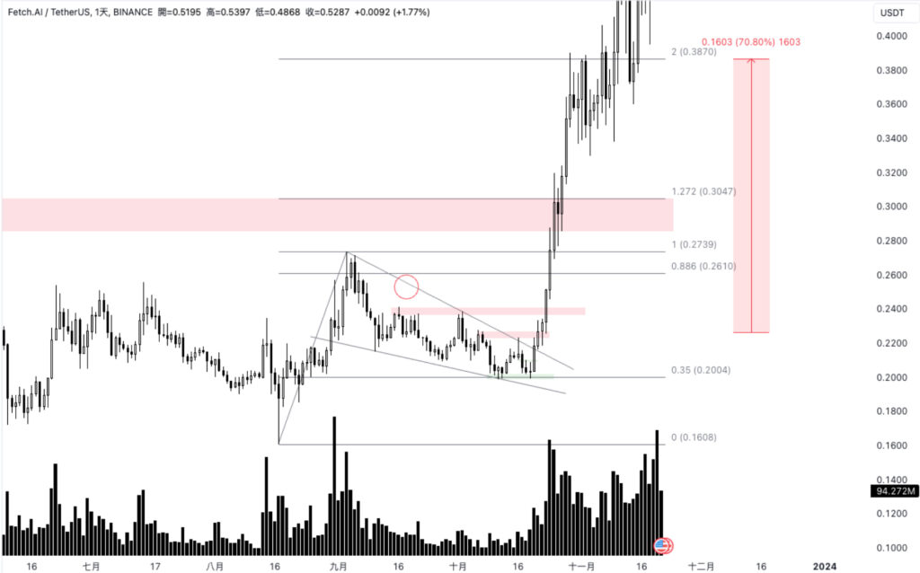下圖為 FETUSDT 在八月中到十月中走出的日線級別下降楔型,首先複習一下下降楔型判斷方向的訣竅,在尾端走出雙底、三重底等結構有較大的機率走出上漲趨勢。